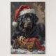 This moody, sepia-toned illustration captures the gentle, protective nature of the massive black Newfoundland, wearing a Santa hat while guarding a cozy wooden cradle on a quiet Christmas night. A heartwarming and traditional holiday design.