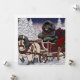 Beautifully hand drawn and colored Newfoundland puppy dog featured in a winter wonderland, horse pulled Santa sleigh carriage