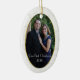 Custom photo Christmas tree ornament done in an oval shape. A pale white lace background has a gold framed oval cut out photo area, and text on the bottom reads, Our First Christmas 2010. Personalize by adding your own photograph and changing the text if you want anything different. Great first ornament for the newly weds and makes a nice gift.