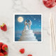 Bride and groom astronauts stand on top of a tiered wedding cake, one wearing a suit and the other a gown, while holding a bouquet.