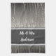 This personalized kitchen towel features a vertical stripe pattern in silver and gray that resembles liquid silver flowing down this towel. A double frame rectangle provides the solid background for a couple's elegant name which can easily be personalized. This distinguished kitchen towel makes a unique and personal gift for bridal showers, weddings, or anniversary gifts.