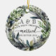 This beautiful design features a green watercolor floral wreath with elegant typography, can be personalized with the initials of the newlyweds, and will look lovely on your Christmas tree.