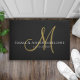 A Modern handwritten script gold script initial, white monogram name on black, and date established, large doormat for your entryway.