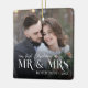 This modern minimalist personalized newlyweds Christmas ceramic ornament features a photo template on each side, with elegant stylish overlay typography “Mr. & Mrs,” with name and year on the front.