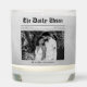 Cool newspaper article wedding favor candle. Personalize it with your event details and a photograph of the bride and groom.