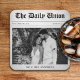 Cool newspaper article wedding reception coasters. Personalize it with your event details and a photograph of the bride and groom.