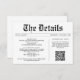 Ensure your guests have all the crucial information for your big day with this stylish newspaper-inspired wedding details enclosure card. Titled "The Details" in a classic newsprint font, the design clearly lays out reception, accommodation, and travel information, complete with a QR code for easy access to your wedding website or honeymoon fund. This organized and cohesive design provides a sophisticated and practical addition to your wedding stationery suite.