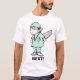 The Doctor is in. Who's next? A cartoon of a surgeon dressed in green scrubs and a white face mask holding a giant hand saw behind his back shouting "NEXT!"
