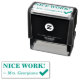 This positive rubber stamp design features the encouraging message "NICE WORK!" and a personalized educator's name. It also features a decorative check mark. It could be used by a teacher or educator when marking assignments, to acknowledge that a student has done well.