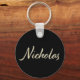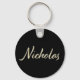 Ein sehr schöner edler personalisierter Button Schlüsselanhänger im whitegold Lettering Look auf schwarz für Nicholas.