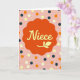 This card features a soft, wavy organic shape in warm orange-red at the center, like a gentle hug around the main word. Inside it, the text “Niece” sits prominently in creamy yellow lettering, with smooth curves that feel affectionate and close ❤️. The last letter includes a small leaf detail tucked into the stroke, adding a sweet, caring touch without crowding the word. Behind the centerpiece, a blush pink background sets a friendly, romantic tone, like a warm blush shared between loved ones. Scattered across the backdrop are round dots in mixed sizes, creating a lively pattern that still feels calm and welcoming. Larger circles appear in sunny yellow, deep teal, and muted orange, while smaller pale-yellow dots sprinkle in between like soft confetti 🌼. The “Niece” text stays centered within the orange-red shape, standing out clearly against the pink field and the layered polka dots. The background shows big yellow, teal, and muted orange circles spaced apart with tiny pale-yellow dots filling the gaps.