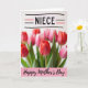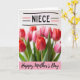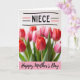 This design shows a lush bouquet of tulips filling the lower two-thirds of the image, with tightly closed blooms in deep reds and soft pinks that feel like they’re leaning close in quiet affection ❤️. A single red tulip sits in sharp focus near the center while the surrounding flowers fade gently into a soft blur, adding depth like a tender crowd gathered around a favorite. Fresh green stems and leaves weave through the arrangement, cooling the warm petals and giving the scene a calm, garden-fresh setting. Near the top, the word “NIECE” appears in crisp black lettering, centered and easy to spot. Thin black horizontal lines frame the word above and below, and a slim red accent line adds a romantic echo of the red tulips. Along the bottom edge, a pale pink banner holds the phrase “Happy Mother’s Day” in dark, flowing lettering, with the text centered across the strip 🌼. The background stays softly out of focus, letting the red-and-pink tulips and the pink banner stand out clearly.