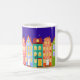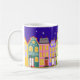 Night City Walking Cat Mug. Cute night cityscape with fancy houses, shining windows, street lights, and a walking cat. Bold, colorful, remarkable.