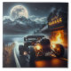 A classic hot rod cruises along a winding road at night, illuminated by the glow of the moon. In the background, a rustic garage emits flames, enhancing the adventurous atmosphere of the scene.