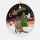 Santa takes off into the night sky as a Belgian Malinois watches.