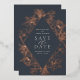 An elegant save the date design featuring your wedding details in chic off-white lettering, nestled in a diamond shaped geometric element. An intricate floral border of rose gold foil lilies and foliage pops against a deep midnight blue background.