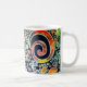Night Lights Reflection Original Abstract Artwork Coffee Mug. Intriguing play of luminous colorful shapes of nature on a mysterious black surface. The surreal outlook is hand-painted in acrylic, displaying tangerine, gold, cerulean, and a dash of orchid, highlighted with pearl white color, laying on a carpet of charcoal. It is an enigma for a passionate viewer, an art lover who will appreciate a never-ending story behind the design. This original painting is made by artist Aleksandra Grbic Hrustic. Copyright, all rights reserved. This colorful mug is the ideal partner for the morning coffee.