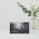 Halloween business card featuring a landscape scene with an owl and bats at full moon.