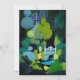 The digital illustration depicts a mysterious blooming garden with many beautiful flowers and trees. A small blue lake is seen among the bushes. A black horse with a blue mane drinks water from a pond. Behind it there is a beautiful lace gate and a glass greenhouse in the night sky. All garden is shrouded in magic and mystery