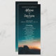 Modern and elegant wedding program template card. Background is a beautiful photograph of a dark turquoise blue night sky with a galaxy of stars above and a sunrise over mountains below. The text is completely customizable and is a stylish pair of script and sans serif fonts. If you are having trouble revising the text areas to suit your needs, message me and I'd be happy to help.