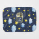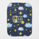 Navy blue background with seamless pattern of golden stars, moon and clouds with a custom monogram in sans serif font on a double square holder in two colors yellow and navy blue