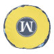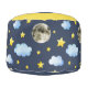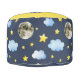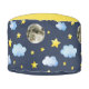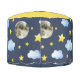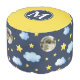 Navy blue background with seamless pattern of golden stars, moon and clouds, and a custom monogram in sans serif font on a double circle holder in two colors white and navy blue