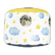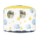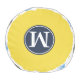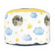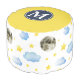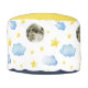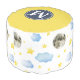 White background with seamless pattern of golden stars, moon and clouds, and a custom monogram in sans serif font on a double circle holder in two colors yellow and navy blue on a yellow background