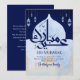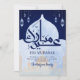 Capture the magic of an Eid night with this deep blue sky design. Featuring glowing mosque silhouettes and hanging white lanterns, this card creates a spiritual and celebratory atmosphere.