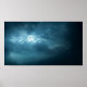 Photo collage, combining multiple images of storm clouds, and a moon photo. The result is an atmospheric, dark blue night sky, with a glowing full moon shining through the clouds.