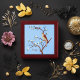 This product displays an image of a Nightingale bird, happily chirping away in a tree full of white blossoms. The original image was painted by the artist W.B. with acrylic paint.