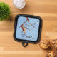 A pot holder with a beautiful image of a nightingale bird, happily chirping away in a tree full of white blossoms. The background and images can be personalized. Original artwork by W.B.