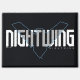 This graphic design cleverly captures the essence of Nightwing, one of Batman's most skilled protégés, through a modern and minimalist aesthetic. The logo features the iconic Nightwing symbol in a sleek, metallic blue that contrasts sharply against the deep black background, creating a striking visual impact. The word "NIGHTWING" is repeated above and below the emblem, with a stylized font that enhances the futuristic vibe of the design. This graphic is not only a nod to Nightwing's agility and stealth but also his evolution from the vibrant, acrobatic Robin into a formidable hero in his own right. The clean lines and sharp angles echo Nightwing's precision and the high-tech nature of his gear and tactics, making this a perfect emblem for fans of the character and the larger DC Universe.