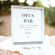 This printable open bar sign features a modern minimalist design with earthy sage green tones. Use this template to change the fonts, font colors, and background color to match your event style.