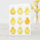 This design shows a 3-by-3 grid of nine tiny, fluffy young birds centered on a bright white background, each facing forward like a friendly little roll call. Painted in a soft watercolor style, their rounded bodies shift through sunny yellows from pale lemon to deeper golden tones, with one bird noticeably warmer in an orange-yellow shade. Simple black dot eyes and petite orange beaks give them an open, curious look, and faint pink blush on their cheeks adds a sweet, affectionate tone, like close friends gathered together. The slightly uneven, feathery edges make each bird feel like it has its own personality while still belonging to the group. A short Easter greeting sits near the top in a light gray tone, balanced by a smaller line of text near the bottom in a matching color. A small 🌷 detail can be tucked beside the top line, and a tiny 🐇 mark can sit near the lower corner without distracting from the birds. The nine birds are arranged in three neat rows of three with even spacing, leaving generous white space around the grid.