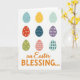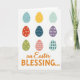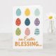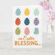 Designed with a bright white background, the card centers on a neat grid of nine decorated egg shapes that feel like a shared set of little keepsakes between friends. Each egg carries its own pattern and color, as if different hands added details with care—one has white curls on turquoise, another has dots on mint and sunny yellow, and another is covered in tiny hearts on warm reddish orange 🌷. Deeper tones join the pastels too, including teal with small musical notes, purple and aqua with diamond shapes, and gentle stripes in rose pink and olive green. The even lighting keeps everything crisp and airy, like a calm spring morning where the designs can do all the talking 🐰. The eggs are evenly spaced and aligned, making the page feel orderly while still showing off lots of variety. Beneath the grid, the words “an Easter BLESSING...” sit near the lower center, with “an Easter” in a flowing dark style and “BLESSING...” in dotted orange lettering. The final dots in the ellipsis trail to the right under the last word, just below the bottom row of eggs.
