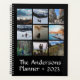 This custom yearly planner features solid color background with a nine photo grid layout, family name, and the year on the front cover. Includes monthly overview, weekly plans, and comes with a page of planner stickers. Available in two sizes, glossy softcover or satin-matte hardcover, and your choice of wire spiral spine color in white, black, or gold.