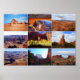Also shown (in center) are The Pulpit and the Altar in the Temple of Sinawava in Zion National Park. Bottom left shows the Green River carving its way through the Island in the Sky Mesa of Canyonlands National Park. Bottom center is the Great White Throne in Zion. Dead Horse Point State Park, center left, shows the Colorado River cutting a sharp curve through the rock. Bottom right are The Monitor and the Merrimack, just north of Canyonlands National Park, which are two buttes named after "iron-clad" ships that battled each other during the Civil War. Center right is a pinnacle in Arches National Park.