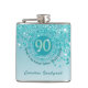 “Ninety & Teal Blue Glitter & Drinking Quote”, is an ideal custom Flask, especially crafted to celebrate, her Ninetieth Birthday. You can personalize it, with your own message, and name. If you want to add a special date, press the “edit button”. On the canvas, add text, choose your font, make sure the new text is within the printing line. If you need help, contact Zazzle or find me on my Zazzle chatroom.