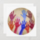 Vibrant, colorful hands reach upwards, overlapping in shades ranging from red to blue. The arrangement creates a dynamic sense of movement and unity.