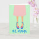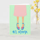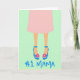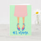 This card shows the lower half of a woman in a soft blush-pink skirt, set against a pastel mint-green background that feels calm and affectionate ❤️. Her legs are drawn in warm skin tones, leading down to electric-blue high heels that add a flirty, going-out-with-you energy. Each shoe has a slim ankle strap with a sunny yellow buckle, like a small bright accent meant to catch someone’s eye. On the outer side of each heel sits a bright pink flower with a yellow center, a sweet little detail that reads like a thoughtful gift 🌼. Along the lower area, the words “No. 1 Mama” appear in thick, hand-drawn lettering in the same electric blue as the shoes. The text sits beneath the legs and shoes, visually grounding the scene while echoing the footwear color for a tied-together look. A pale yellow border lightly frames the mint background, keeping the composition neat and softly sunny. The blue heels, yellow buckles, and pink flowers stand out sharply against the mint field and the thin yellow frame.