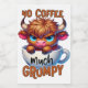 A funny and sarcastic colorful design showcases an adorable highland cow perched in an empty coffee cup. With a grumpy expression, big blue eyes, and brown fur, the cow adds a charming touch. The vibrant text reads, "No coffee much grumpy." This design is featured on a variety of products, making it a perfect gift for coffee enthusiasts.