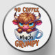 A funny and sarcastic colorful design showcases an adorable highland cow perched in an empty coffee cup. With a grumpy expression, big blue eyes, and brown fur, the cow adds a charming touch. The vibrant text reads, "No coffee much grumpy." This design is featured on a variety of products, making it a perfect gift for coffee enthusiasts.