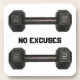 Photograph of dumbbells with the words "No Excuses" printed between. Background color customizable.