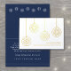 Send simply stylish holiday wishes to clients, customers and business associates with elegant real foil holiday cards. All wording on this folded card template is simple to personalize. The Christmas ornaments and text on the front side are printed with real metallic gold foil on a basic white background. The modern minimalist navy blue and white design features chic elegant snowflake ornaments and simple classic typography. Please note that interior is printed color, not metallic foil. Available in both small quantities and bulk, these cards are suitable for small business entrepreneurs as well as corporate professionals. Business clients, family, and friends will love the sophisticated luxury of these personalized holiday greeting cards. Seasons Greetings!