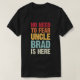 Personalized uncle shirt featuring a fun and playful design with a superhero character named Uncle Brad, perfect for introducing a special uncle to the family.