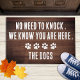 Introducing the perfect door mat for all dog lovers out there! This modern and stylish mat is the ideal way to welcome guests into your home with a touch of humor and cuteness. The faux wood material is both durable and environmentally friendly, while the paw prints and the playful phrase "No Need To Knock, We Know You Are Here...The Dogs" will bring a smile to anyone's face.