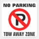 Parking not allowed sign stickers. Square no parking sign icon with a black capital letter P with a red not allowed stripe and red round border stickers sheet with fully customizable texts "No parking" and "Tow away zone" square small stickers. This parking prohibited warning product is fully customizable, add your personal texts and images.