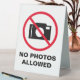 No photos allowed camera prohibited warning Table Tent Sign . Handy modern stop icon for museum, private property, library, shop, store, quiet no talking area, room, park, school exams, office, wedding, party, business, company, hospital, university, care home, zoo, shop, store, public space etc. Camera forbidden to use notice. Stop taking pictures (with flash). Reversible display.