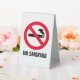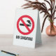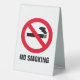 No smoking. Forbidden to smoke reversible Table Tent Sign. Custom non smoke signs for restaurant, bar, terrace, park, garden, shop, cafe, mall, hospital, business, office, workplace, store, hall, court, sports club, hotel room and other public places. Make your own signage with a cigarette logo symbol and red prohibited circle. Handy non smoking infographics for customers, clients, visitors, guests, tourists etc. Also for no vaping allowed.