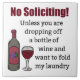 No Soliciting! Unless you are dropping off a bottle of wine and want to fold my laundry. It's a new twist on the common "no soliciting" sign. Make light of the situation with this humorous sign at your front door. Who knows? Maybe someone will leave a bottle of wine and fold your laundry. This design is suitable for white and light-colored backgrounds. Thank you to the buyer who pointed out that the tile itself doesn't have a hanger. To hang an unframed tile, apply a D-hook to the back with E-6000 glue or use a 3M Command picture hanging strip.
